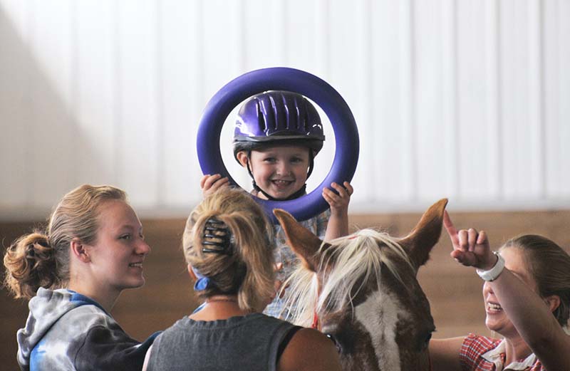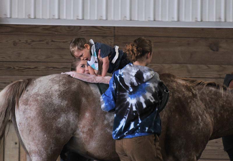 How does this work?? The horse takes an average of 100 steps per minute, which provides multiple opportunities for an adaptive response. No other piece of therapy equipment can do this and no other equipment can mimic the consistency of the input of a well-trained horse. With each step, the child receives sensory and movement input and responds with postural control, core strength, and weight shifting. The three-dimensional movement of the horse moves the client’s hips in a way that mimics pelvic movement in walking. This can help with gait patterns and postural control. Alternate positions may also be used to facilitate the development of upper body strength, and scapular stability, or to enhance vestibular input. Additional therapeutic activities can also be layered in to work on coordination and fine motor skills.